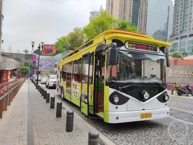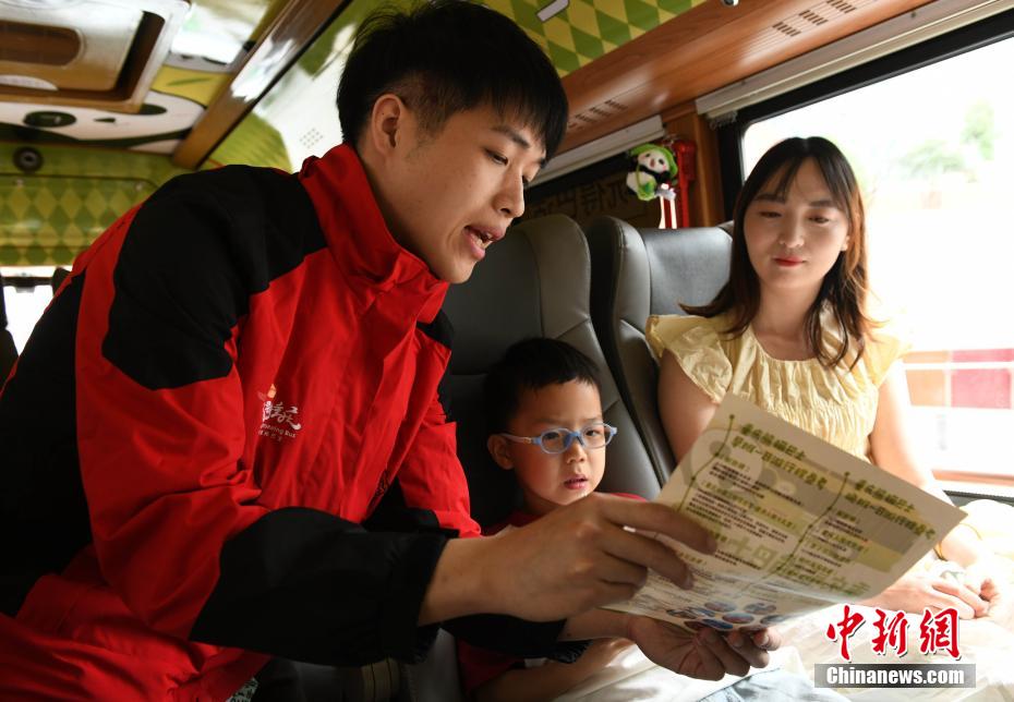 熊猫巴士讲解员向乘客介绍旅游线路。中新网