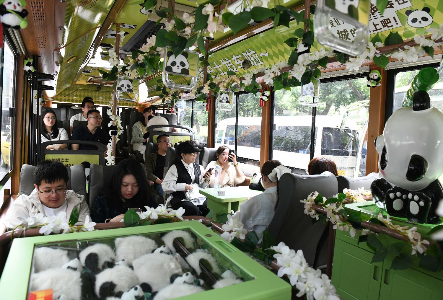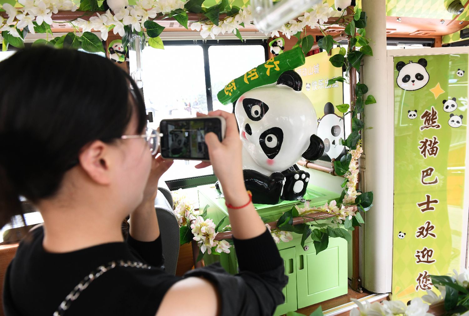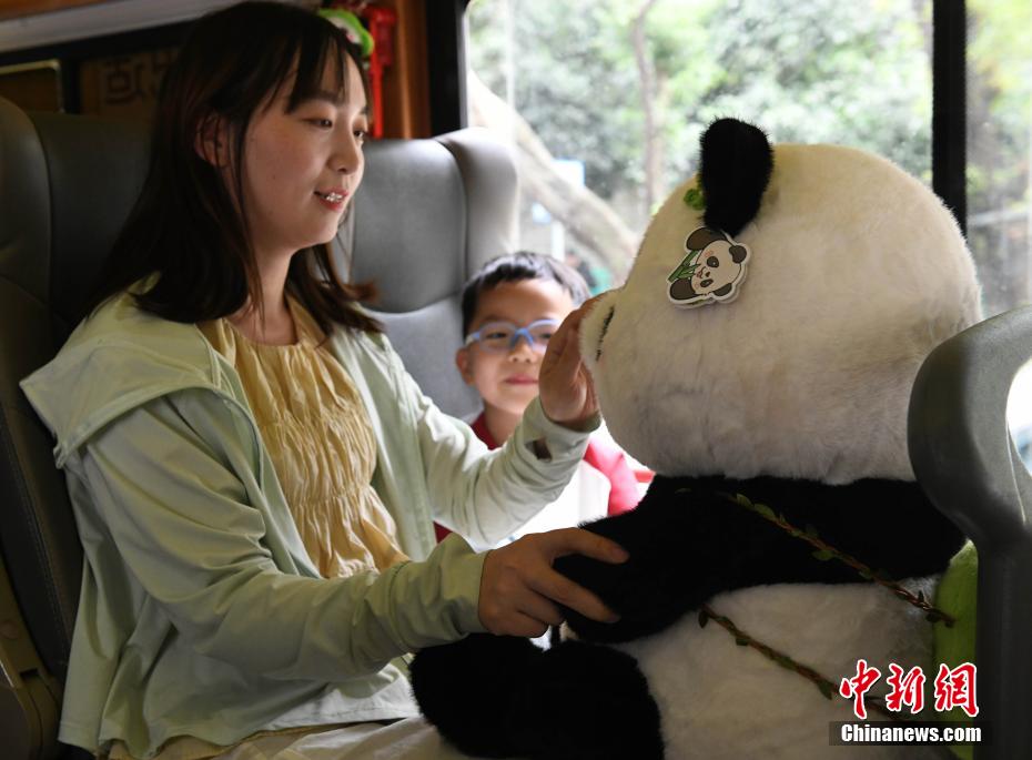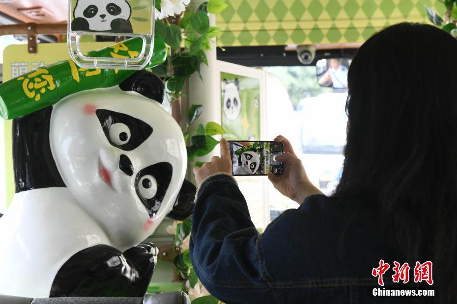 4月15日,重庆公交迎来新成员,一辆以大熊猫为主题的熊猫巴士载着首批乘客从重庆渝中来龙巷出发,开启山城“萌趣魔幻”之旅。该巴士全车身采用大熊猫图案涂装,车厢内用了大量大熊猫玩偶进行装饰,营造出与萌宠同行的欢乐氛围。图为车厢内的大熊猫装饰物吸引乘客拍照留念。中新社