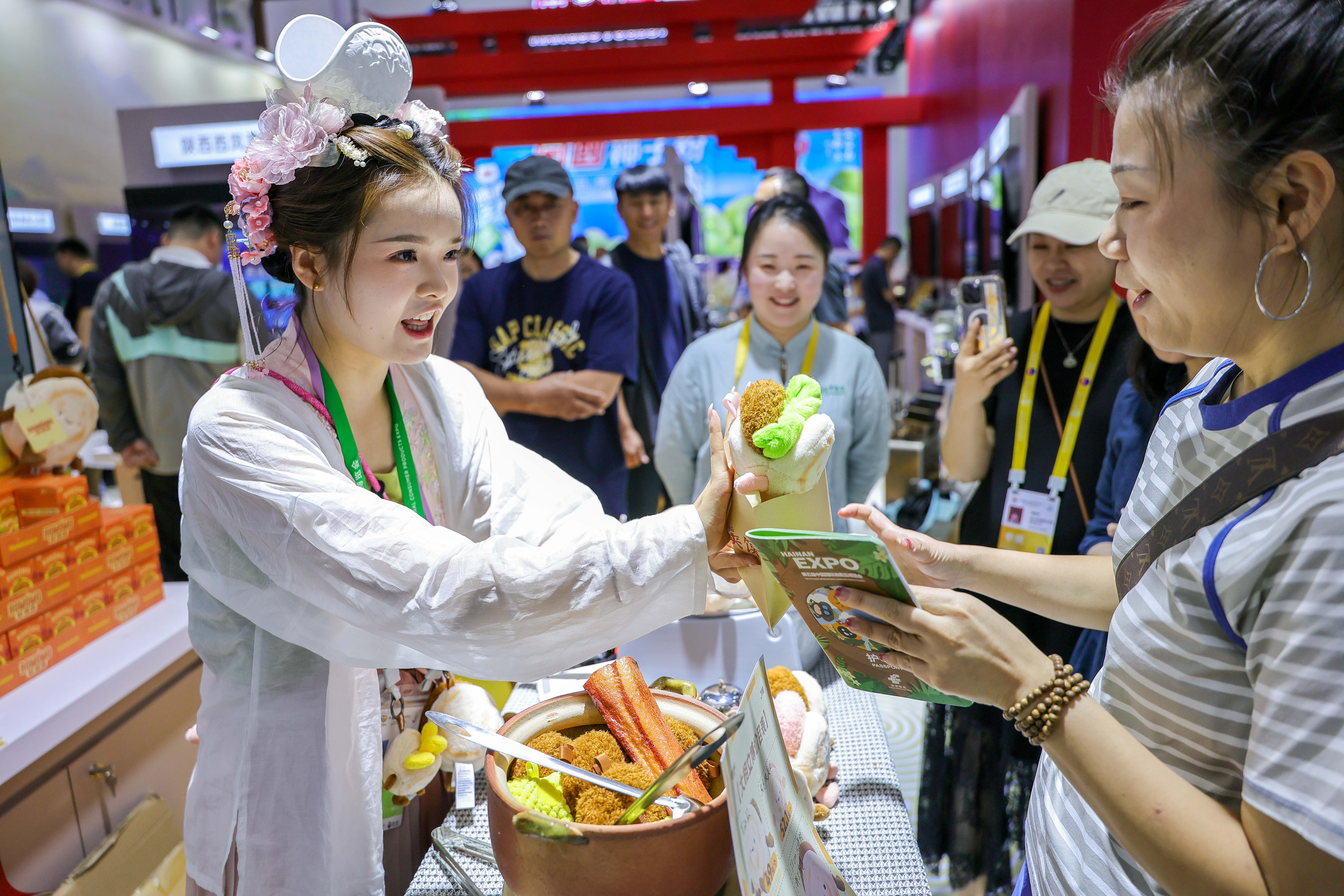 工作人员在演绎情绪价值拉满的“肉夹馍”毛绒玩具,吸引参观者驻足。中新社