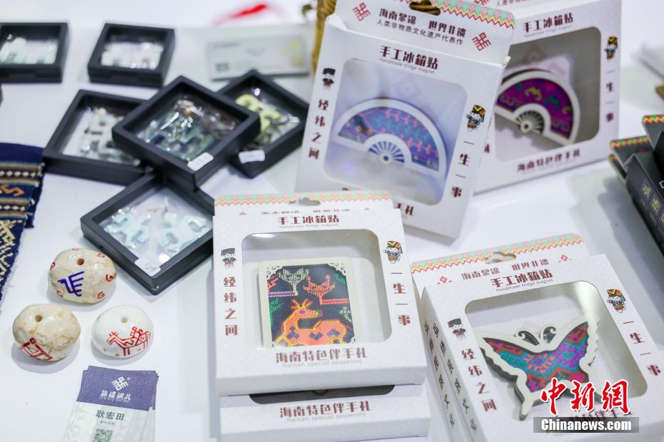 以黎锦为元素的冰箱贴等文创产品在海南馆展出。中新网