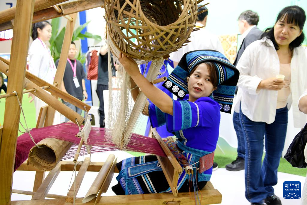 工作人员在第五届消博会广西展台为参观者演示并介绍壮族织锦技艺。壮族织锦技艺是国家级非物质文化遗产。新华社