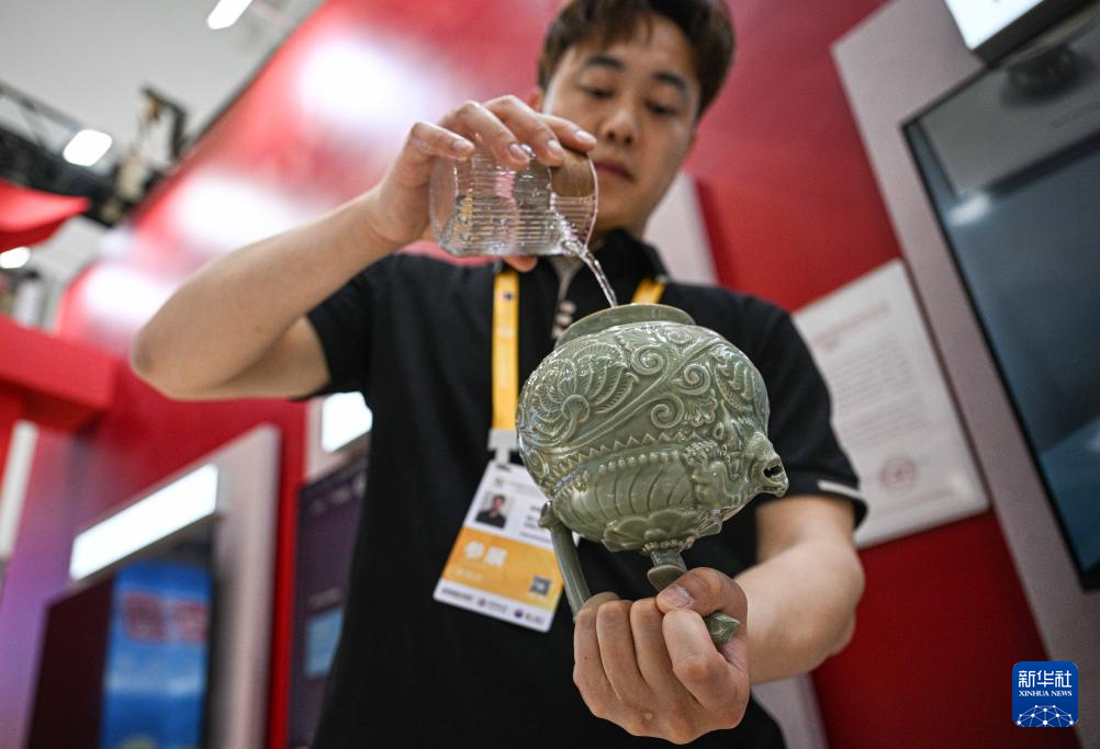 工作人员在消博会陕西馆展示耀州窑倒装壶。耀州窑陶瓷烧制技艺是中国国家级非物质文化遗产。新华社