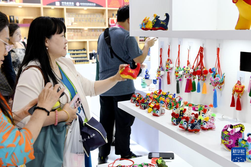 参观者在山西展台选购布老虎(黎侯虎)产品。布老虎(黎侯虎)是中国国家级非物质文化遗产。新华社