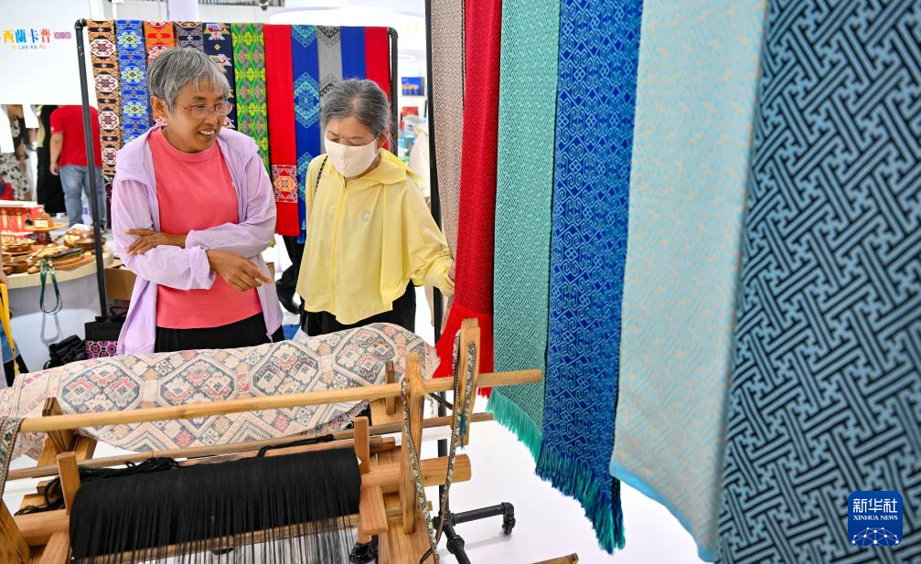观众在消博会湖北馆选购西兰卡普围巾。西兰卡普编织技艺是中国国家级非物质文化遗产。新华社