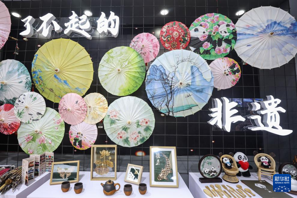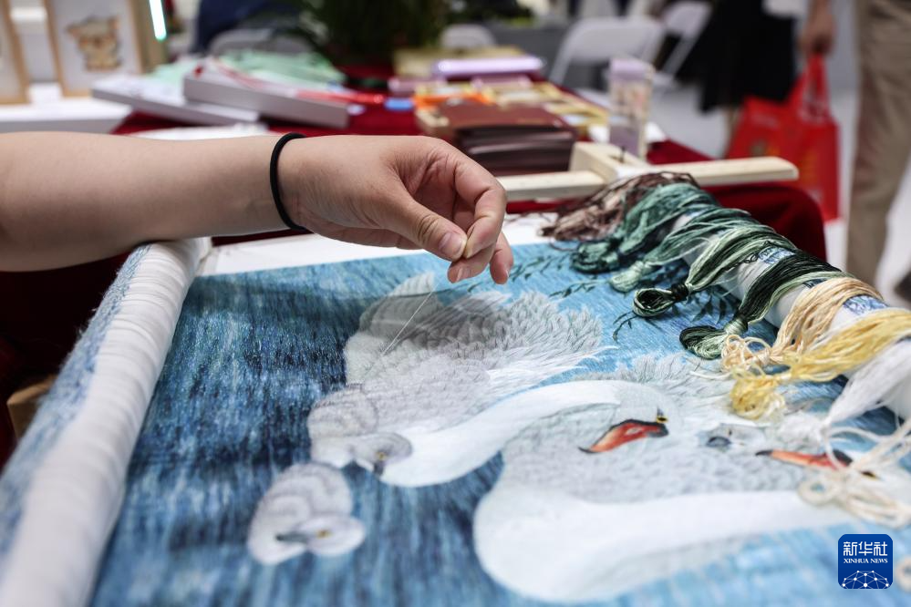 参展商在消博会上制作湘绣。湘绣是中国国家级非物质文化遗产。新华社