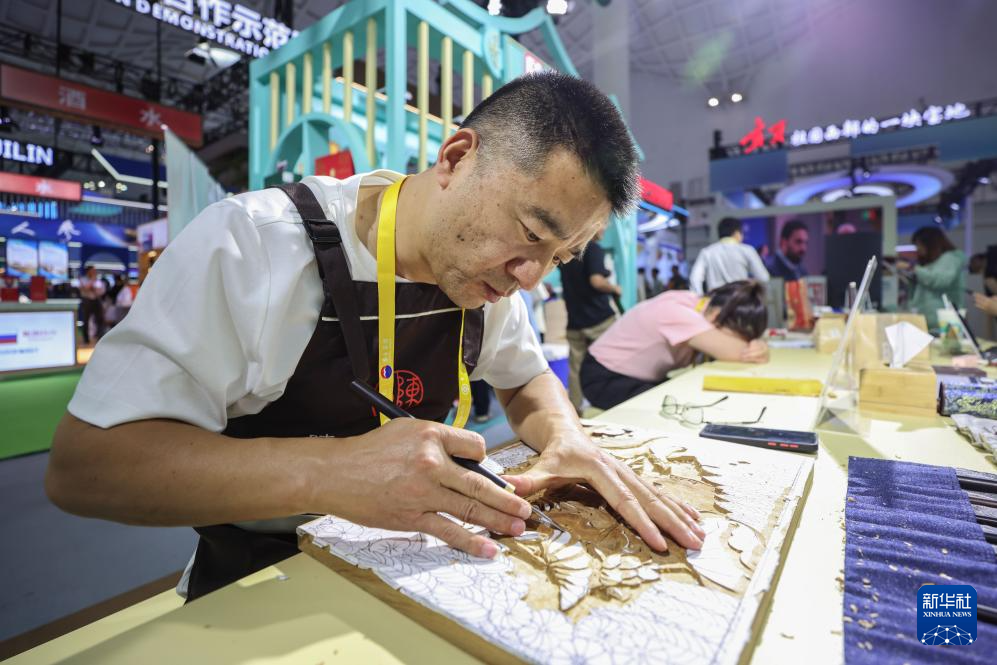 东阳木雕传承人在消博会现场雕刻木雕。东阳木雕是中国国家级非物质文化遗产。新华社