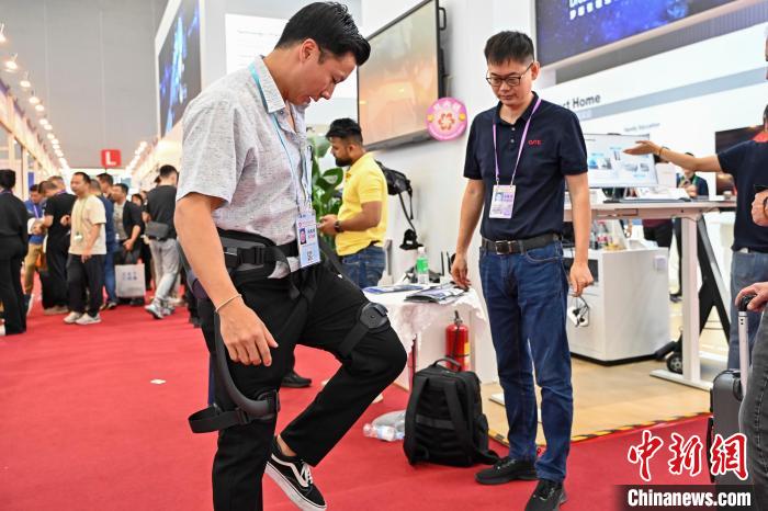 广交会采购商在家用电器展区体验外骨骼机器人。中新网