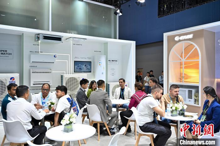 4月16日,广交会采购商在家用电器展区与参展商洽谈。中新网