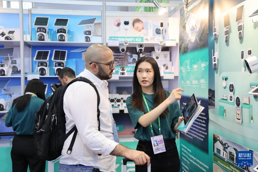 4月15日,客商在广交会上选购安防产品。新华社