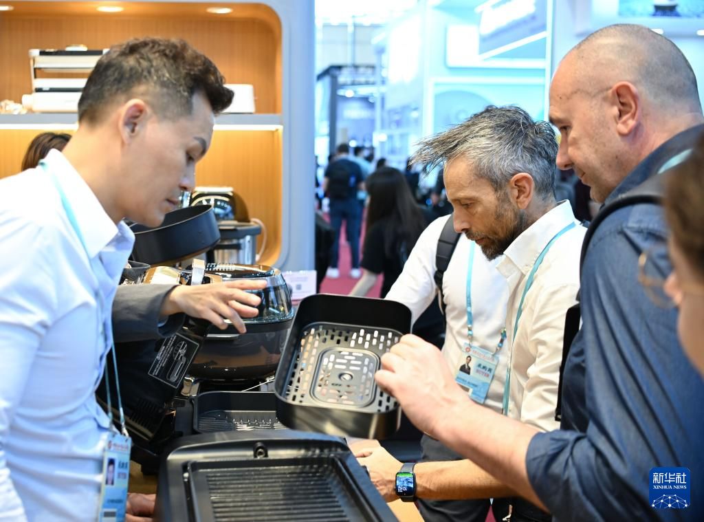 4月15日,境外采购商在厨房家电展区洽谈。新华社