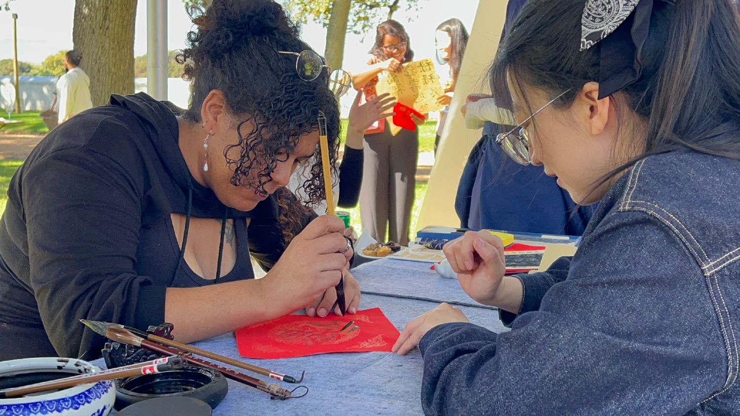 当地时间4月17日,南非民众在开普敦伊兹科(Iziko)博物馆体验写“福”字。中新社