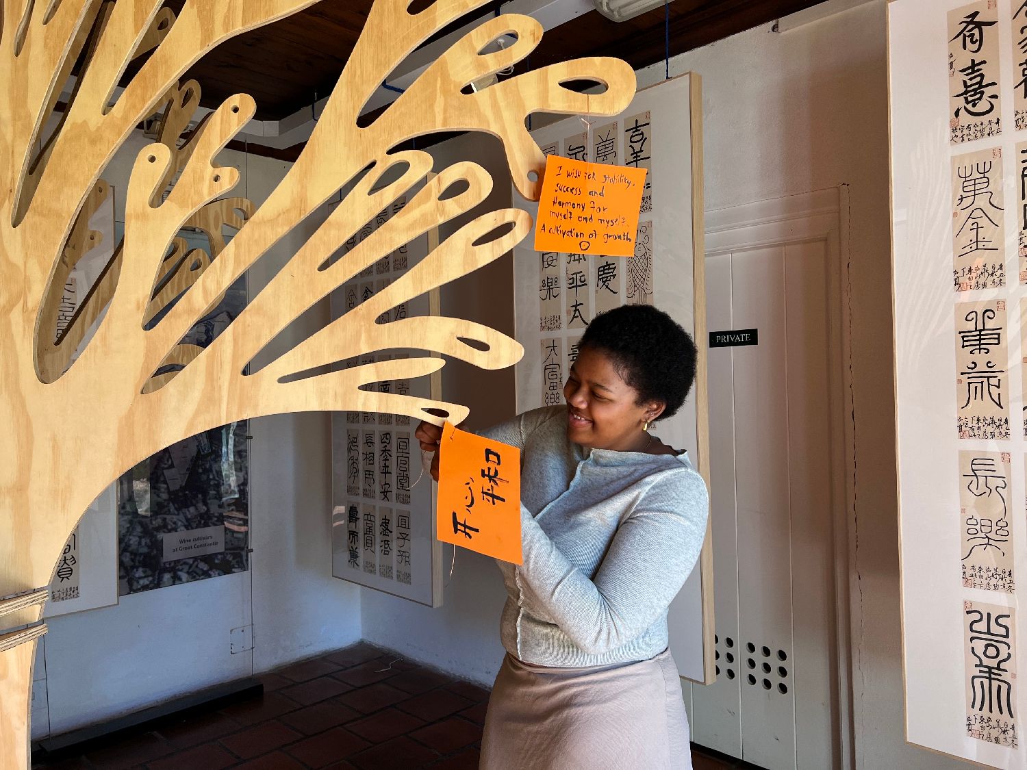 当地时间4月17日,一名南非中文学习者在开普敦伊兹科(Iziko)博物馆将亲手书写的“开心平和”心愿卡挂上愿望树。中新社