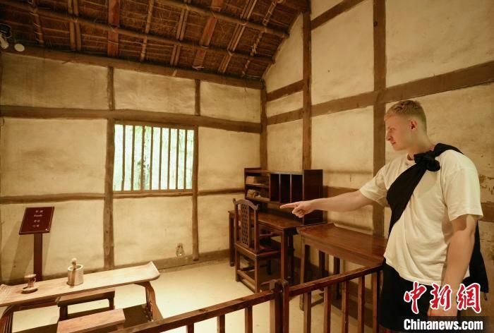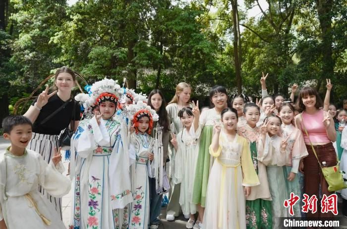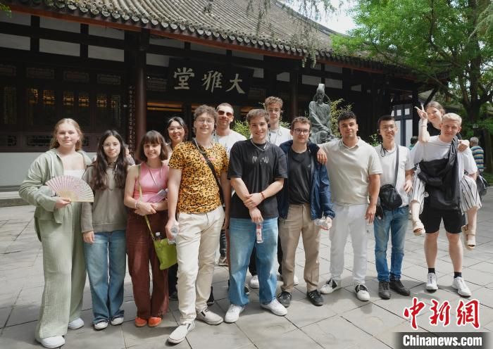 两名德国学生在杜甫草堂门前摆姿拍照。