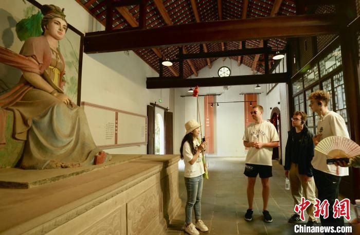讲解员在展厅为德国师生讲解。
