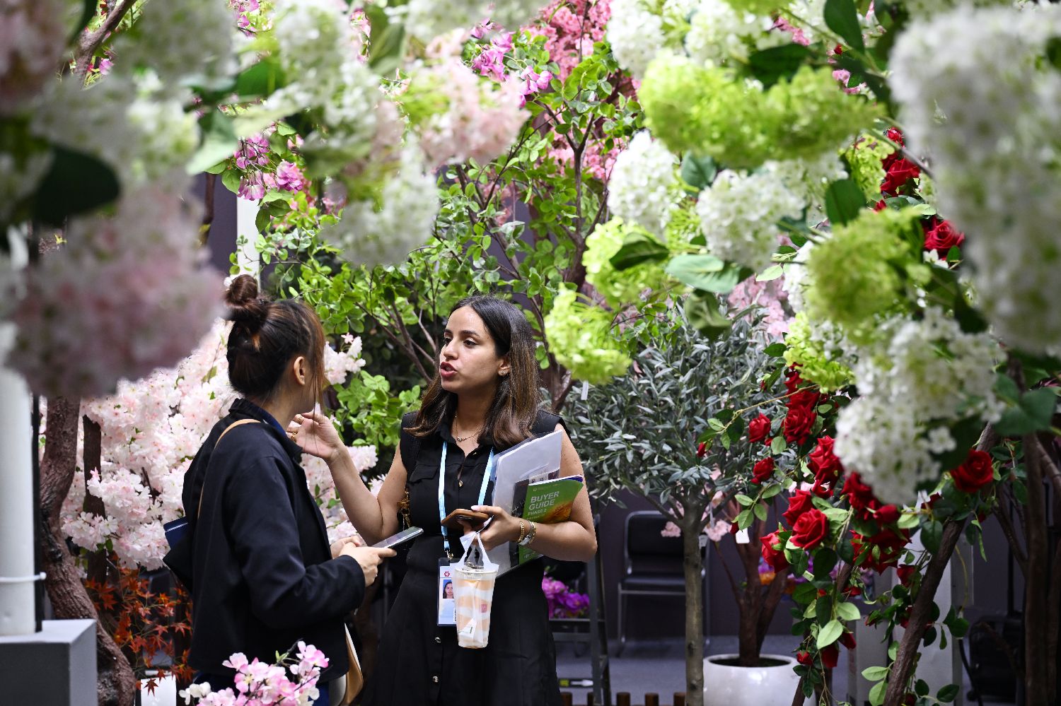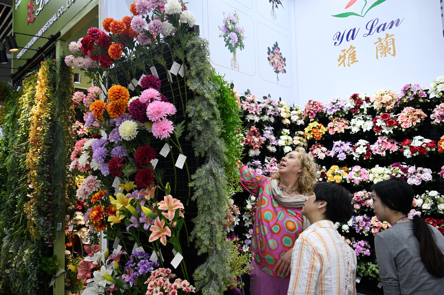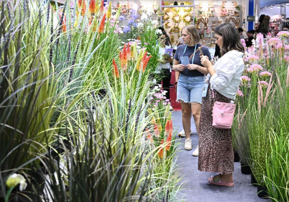 4月23日,在第137届广交会上,境外采购商观看仿真花草展区。新华社