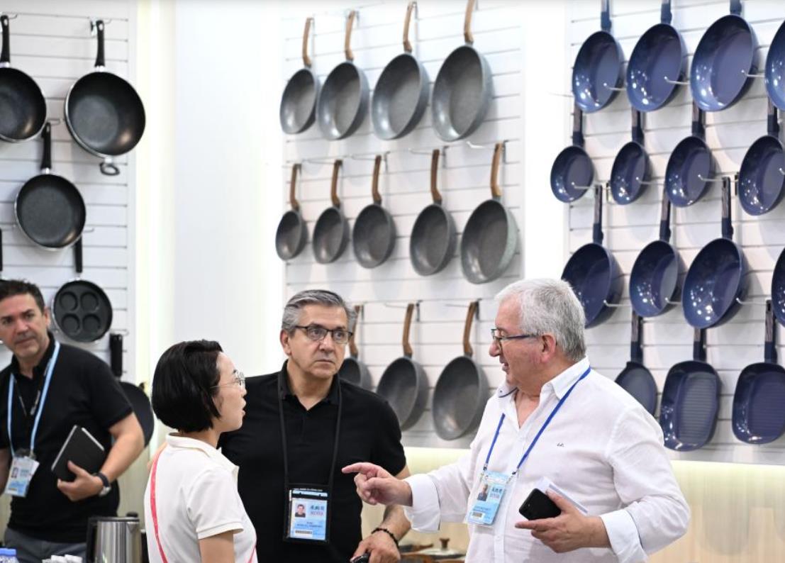 4月23日,在第137届广交会上,境外采购商在厨具展区洽谈。新华社