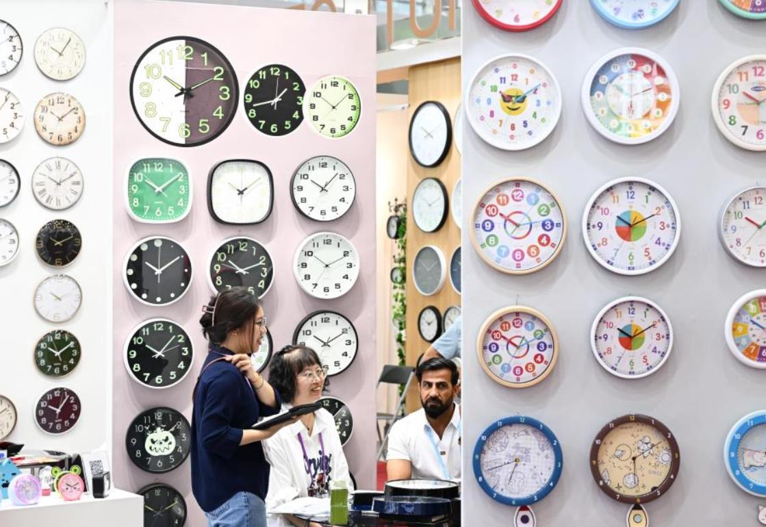 4月23日,在第137届广交会上,境外采购商在钟表展区洽谈。新华社