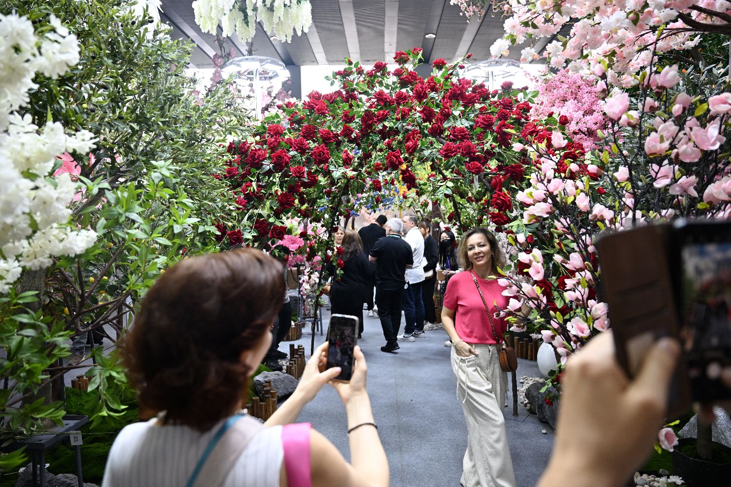4月23日,第137届广交会园林用品展区吸引境外采购商逛展拍照。中新社