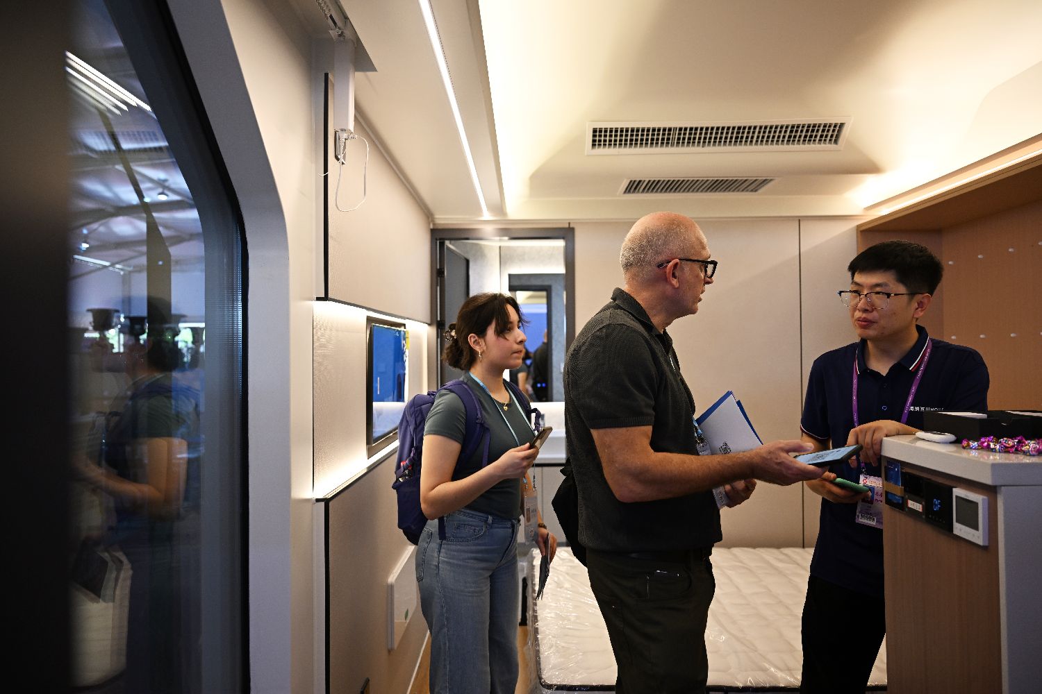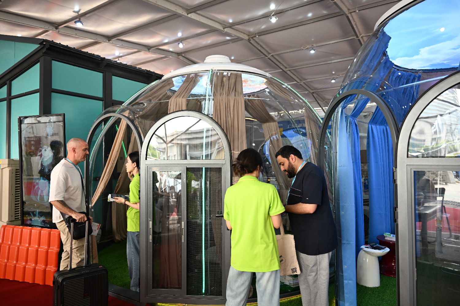 本期展会首次设立集成房屋专区,展出活动房屋、模块化房屋、可拓展房屋等产品。图为4月23日,第137届广交会的集成房屋专区吸引境外采购商咨询。中新社
