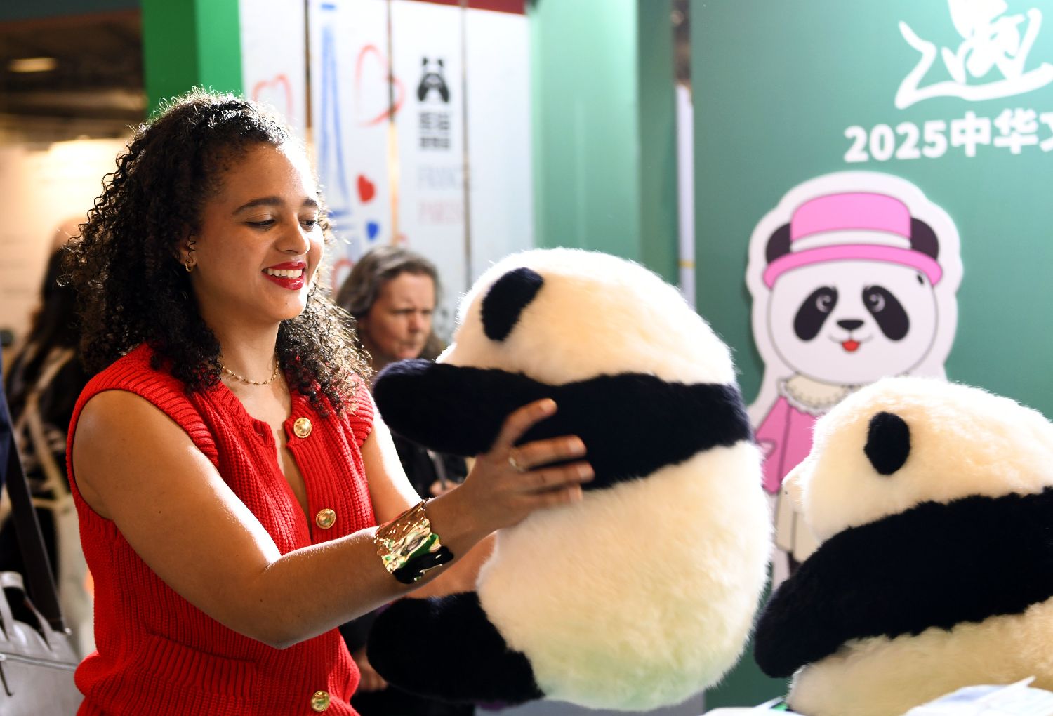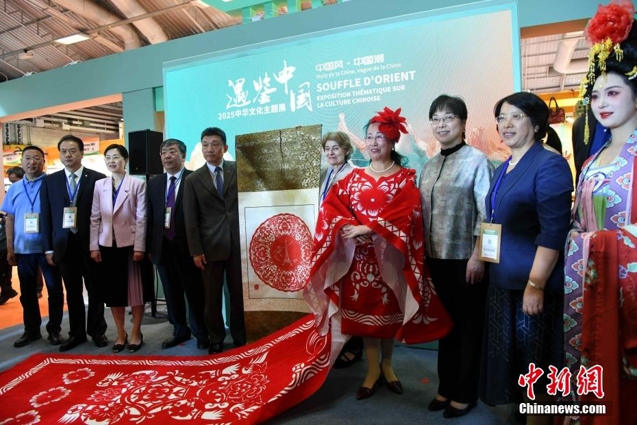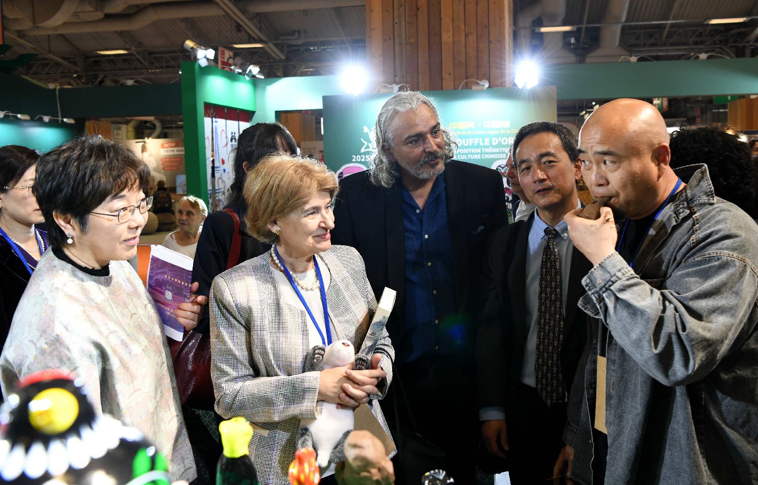 当地时间4月30日,“遇鉴中国”2025中华文化主题展在巴黎国际博览会拉开帷幕。图为民众观赏中国展区的文创展品。中新社