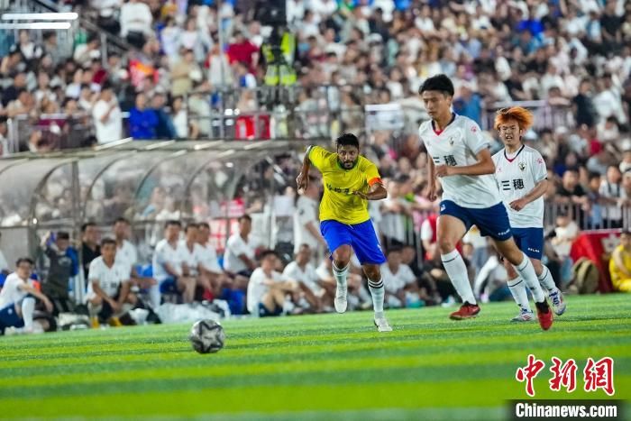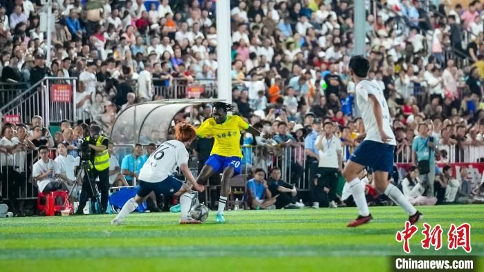 三穗鸭美食足球队球员与巴西狮子足球队球员在比赛中。