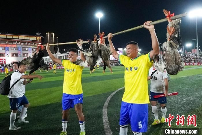 巴西狮子足球队球员在比赛结束后展示赢得的三穗鸭奖品。