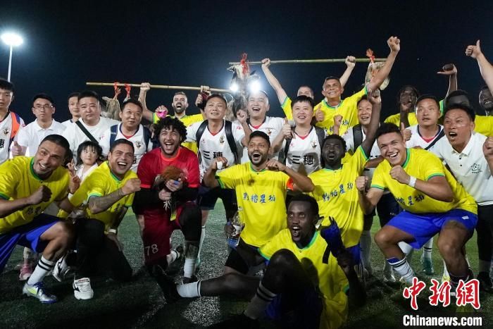 三穗鸭美食足球队与巴西狮子足球队合影留念。