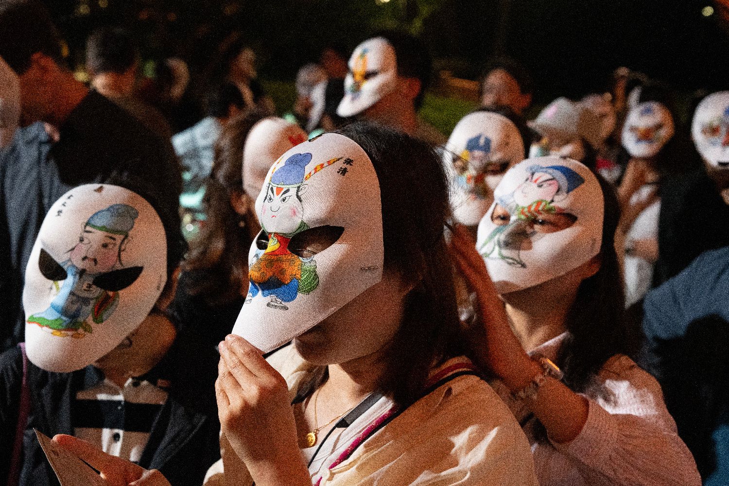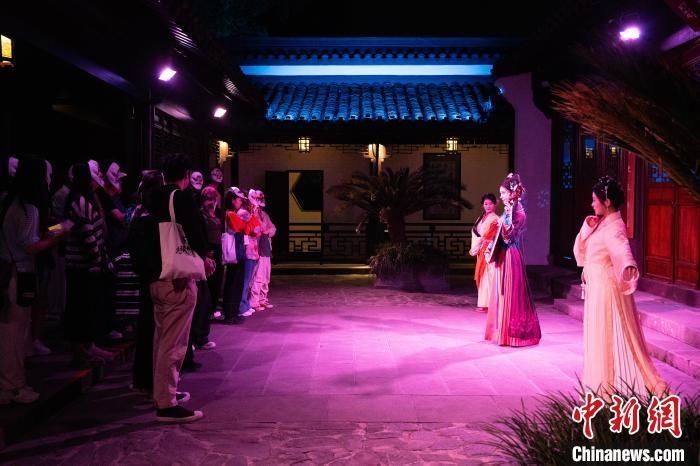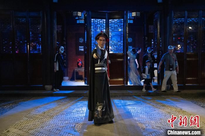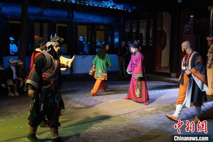 头戴水浒人物面具的观众沉浸式观看演出。中新网