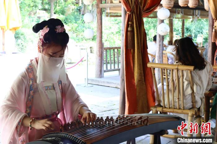 5月12日,濮院时尚古镇内,演艺人员身着汉服弹奏古筝。中新网