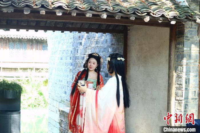 5月12日,游客身着汉服在濮院时尚古镇拍照打卡。中新网
