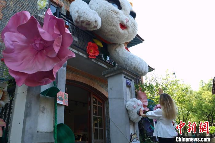 5月12日,游客与濮院时尚古镇内的大型猫咪艺术装置互动。中新网