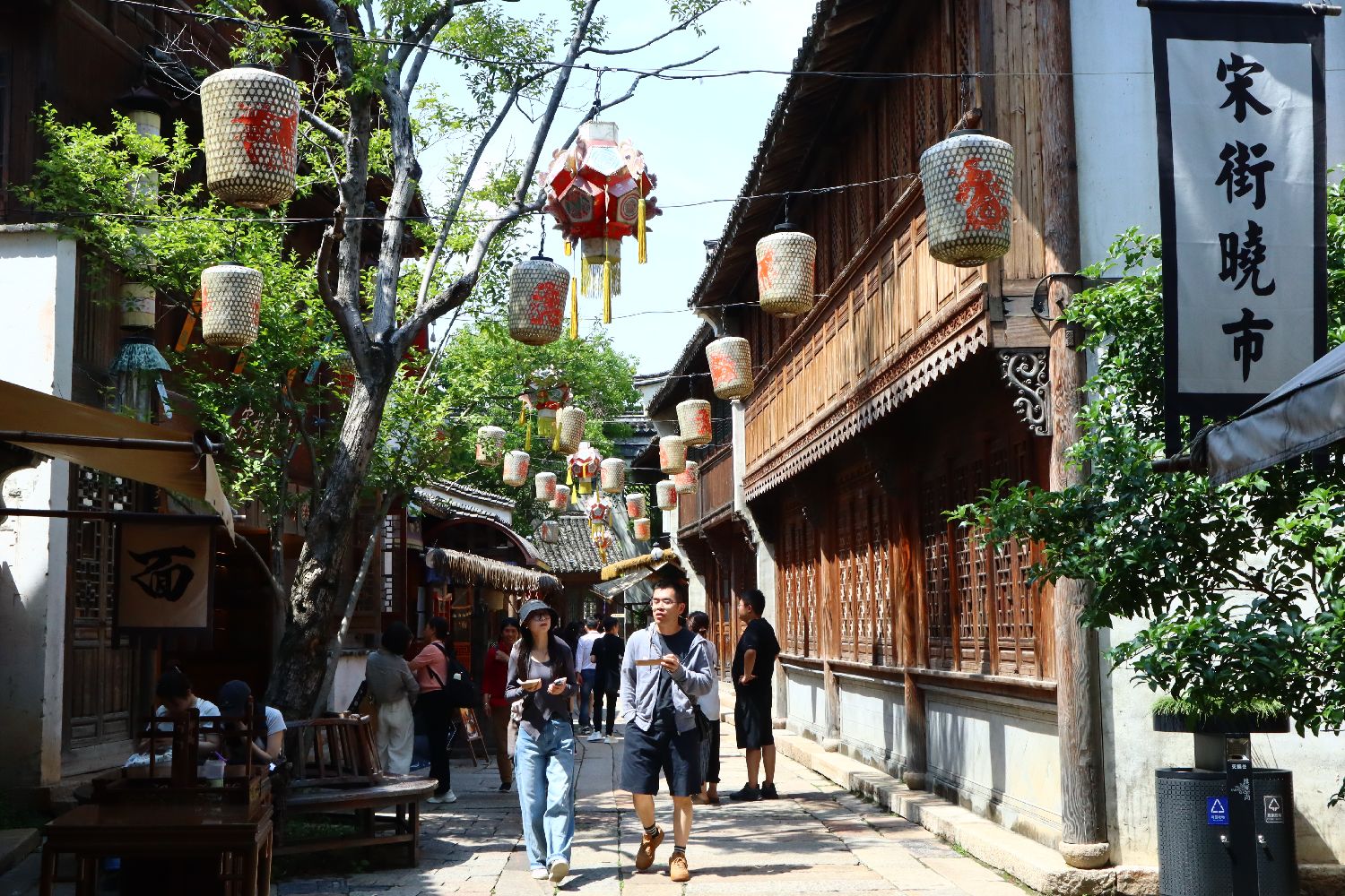 浙江桐乡濮院有近千年建镇史,曾因“日出万匹绸”被誉为“嘉禾一巨镇”,如今为中国重要针织产业基地。濮院时尚古镇融合江南水乡风格与针织时尚特色,吸引游客纷至沓来。图为5月12日,濮院时尚古镇内,宋代风格街市吸引游客。中新社