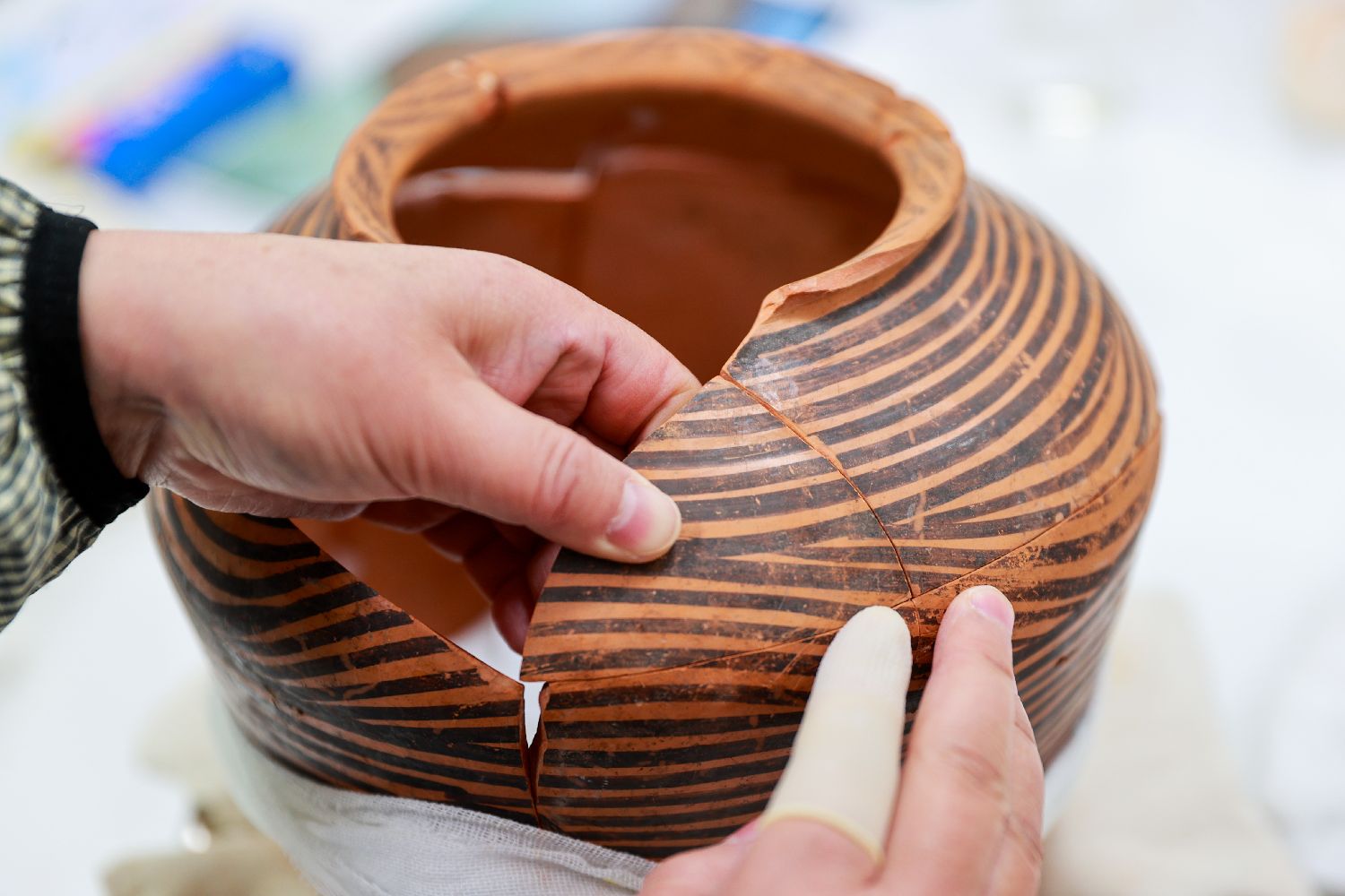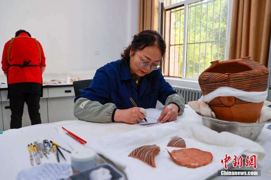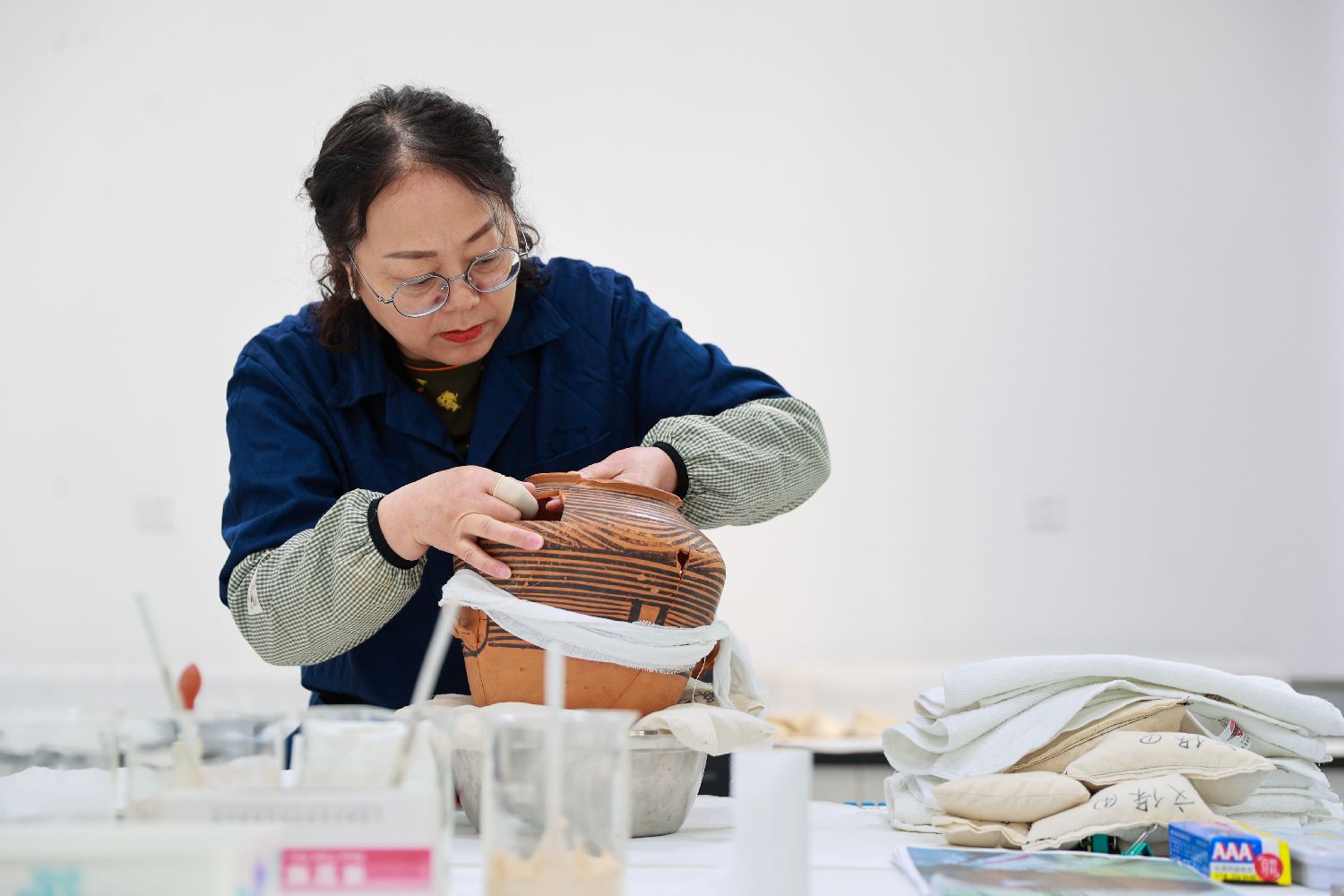 5月13日,文物修复师陈佳丽修复马家窑水波纹彩陶罐。中新社