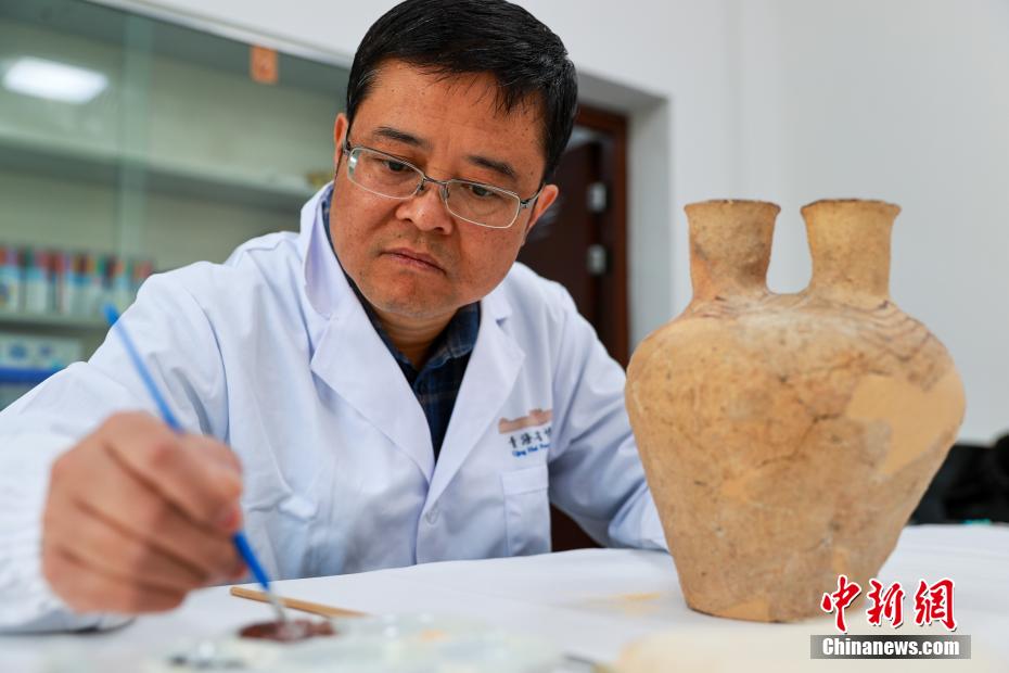 5月13日,文物修复师李峰修复新石器时代宗日文化折线纹彩陶壶。中新网