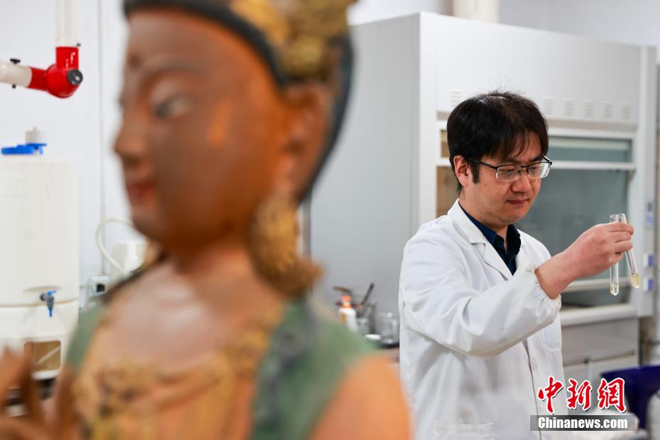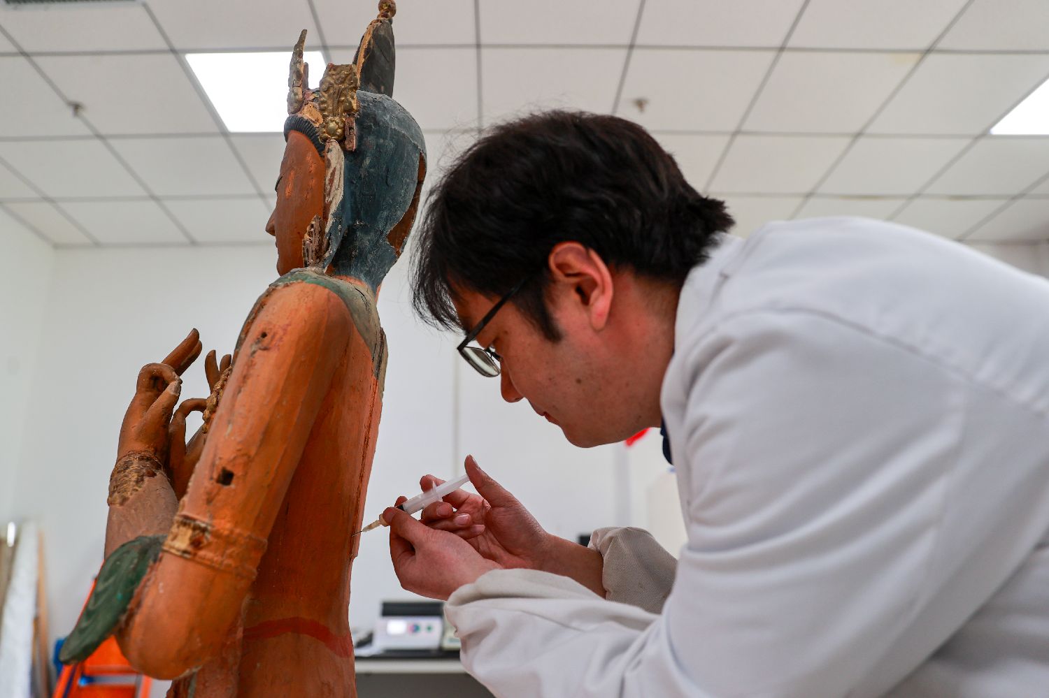 青海省博物馆文物保护中心自成立以来,已修复逾700件珍贵文物。文物修复师们日复一日,用妙手匠心“唤醒”文物新生。图为5月13日,该中心文物修复师刘星星修复明弥勒菩萨彩绘木雕座像。中新社