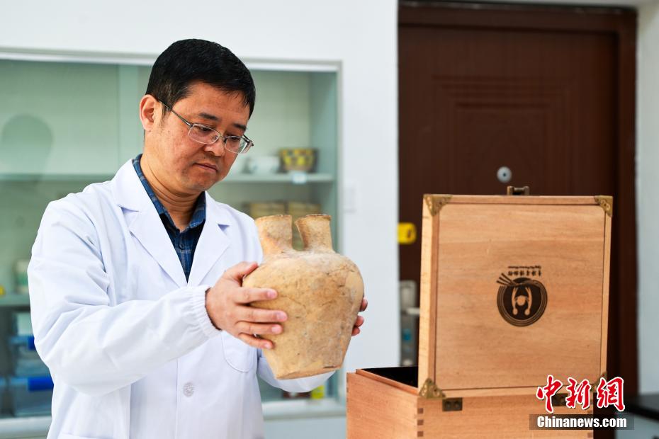 5月13日,文物修复师李峰取出待修复的新石器时代宗日文化折线纹彩陶壶。中新网