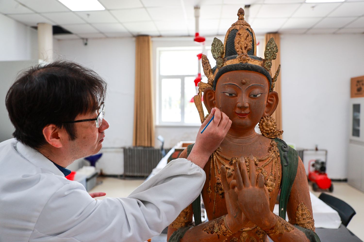 5月13日,文物修复师刘星星修复明弥勒菩萨彩绘木雕座像。中新社