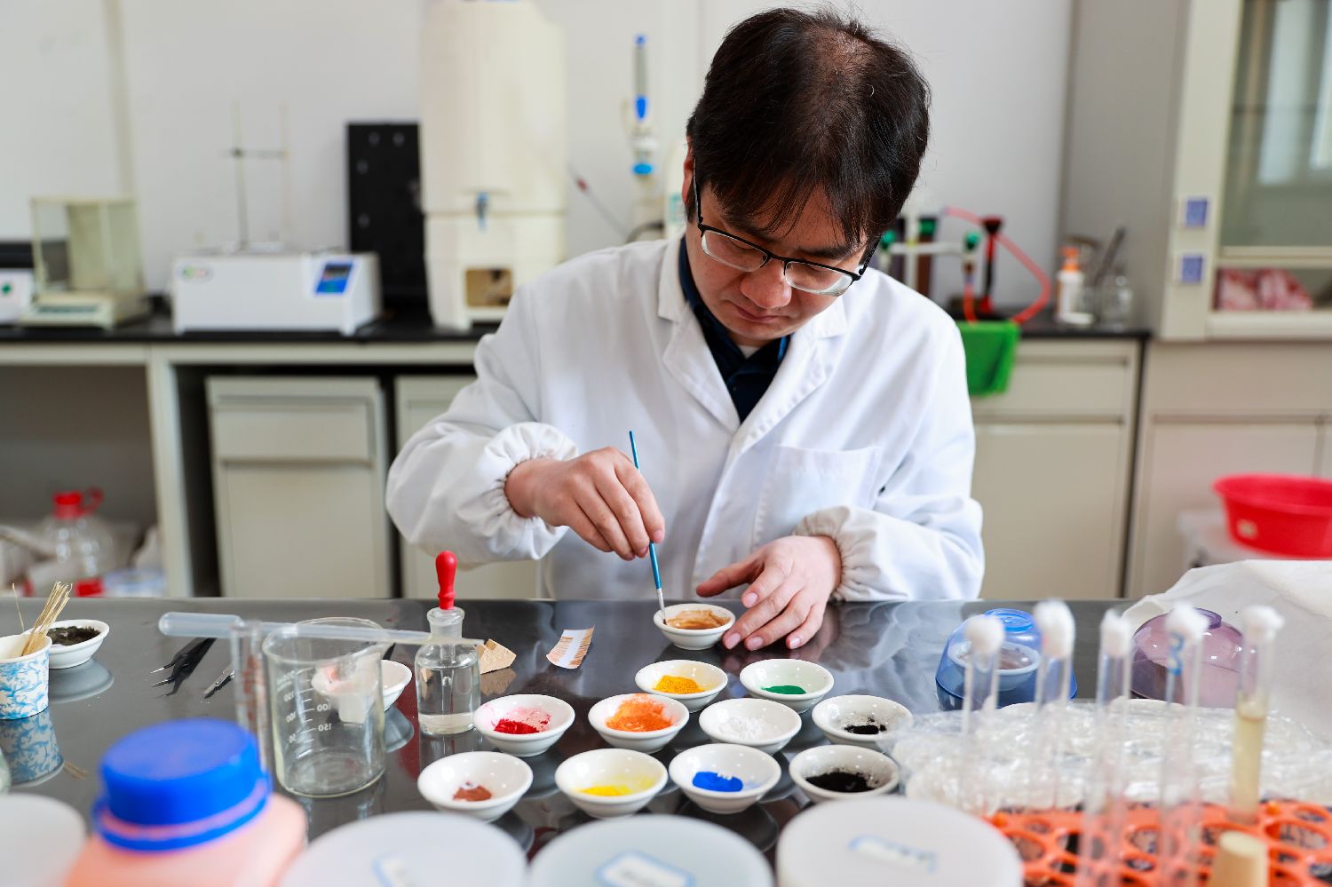 5月13日,文物修复师李峰调制修复文物所需颜料。中新网