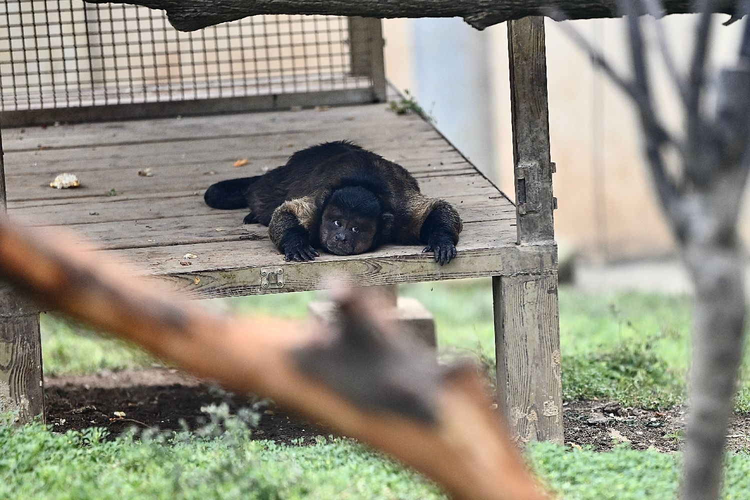 近日,合肥野生动物园一只名为“大壮”的黑帽悬猴,因“国字脸”的独特长相和灵巧的生存智慧,走红网络,吸引来自中国各地的游客前去一睹风采。据悉,黑帽悬猴属于卷尾猴科,是一种在南美洲分布、体型中等的灵长类动物。图为5月14日,方脸猴“大壮”在树屋下打盹。中新社