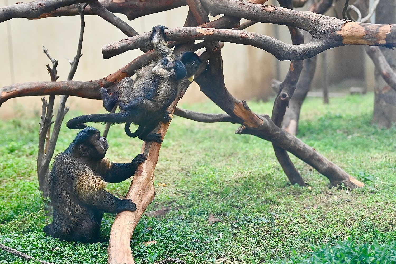 5月14日,方脸猴“大壮”一家在玩耍。中新社