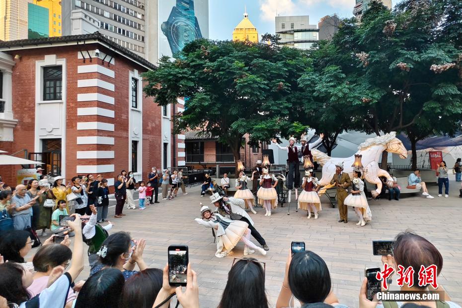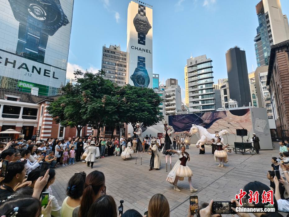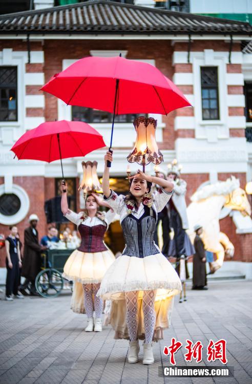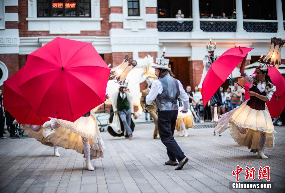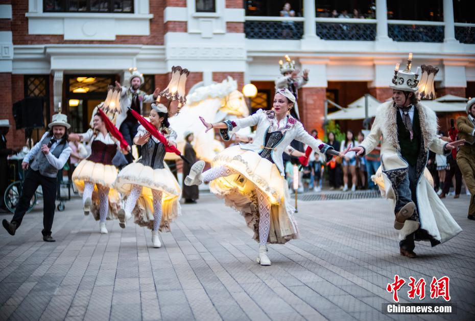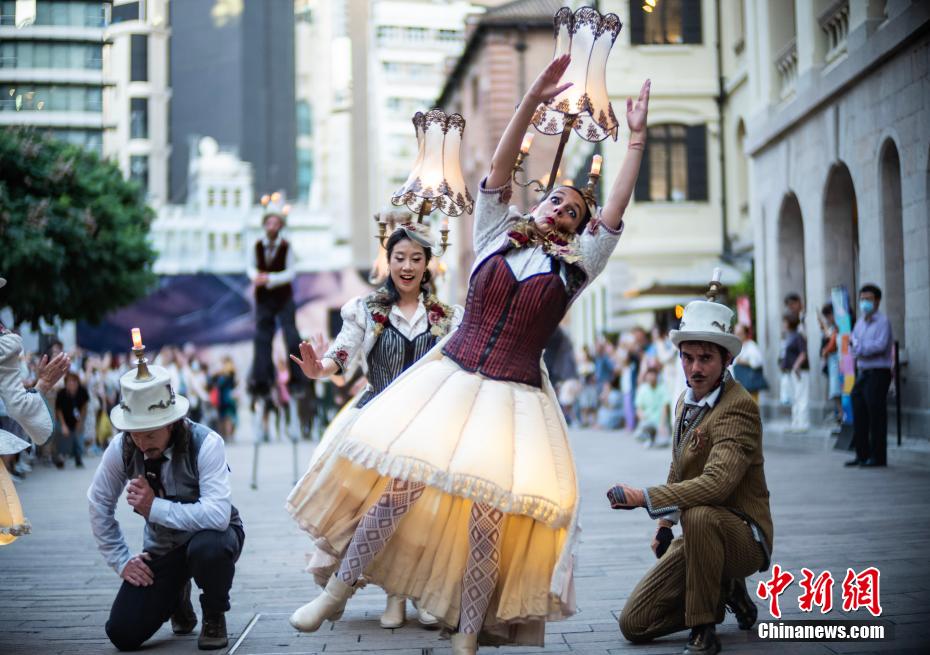 5月14日,“法国五月艺术节”内容之一的《幻夜舞会》在香港大馆检阅广场上演。演出编导受法国已故印象派画家雷诺阿和德加的画作启发,将视觉艺术、杂技、木偶表演和舞蹈融为一体,舞者们脚踩高跷、头顶仿制电灯和蜡烛装饰,随着法语乐曲翩翩起舞,带领观众重温19世纪末法国街头表演的魅力。图为舞者们为观众奉献精彩的演出。中新社