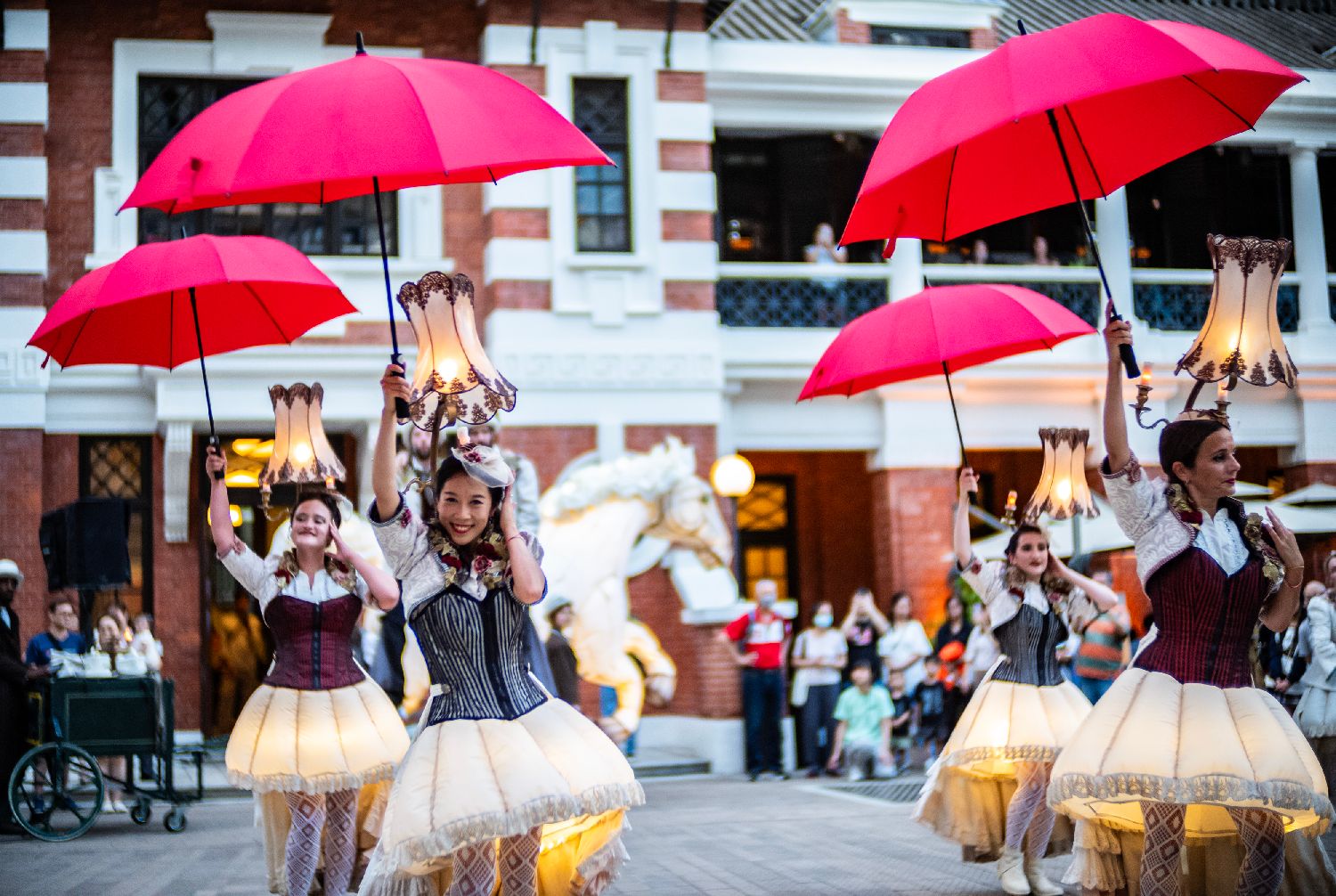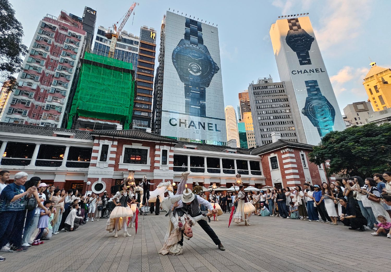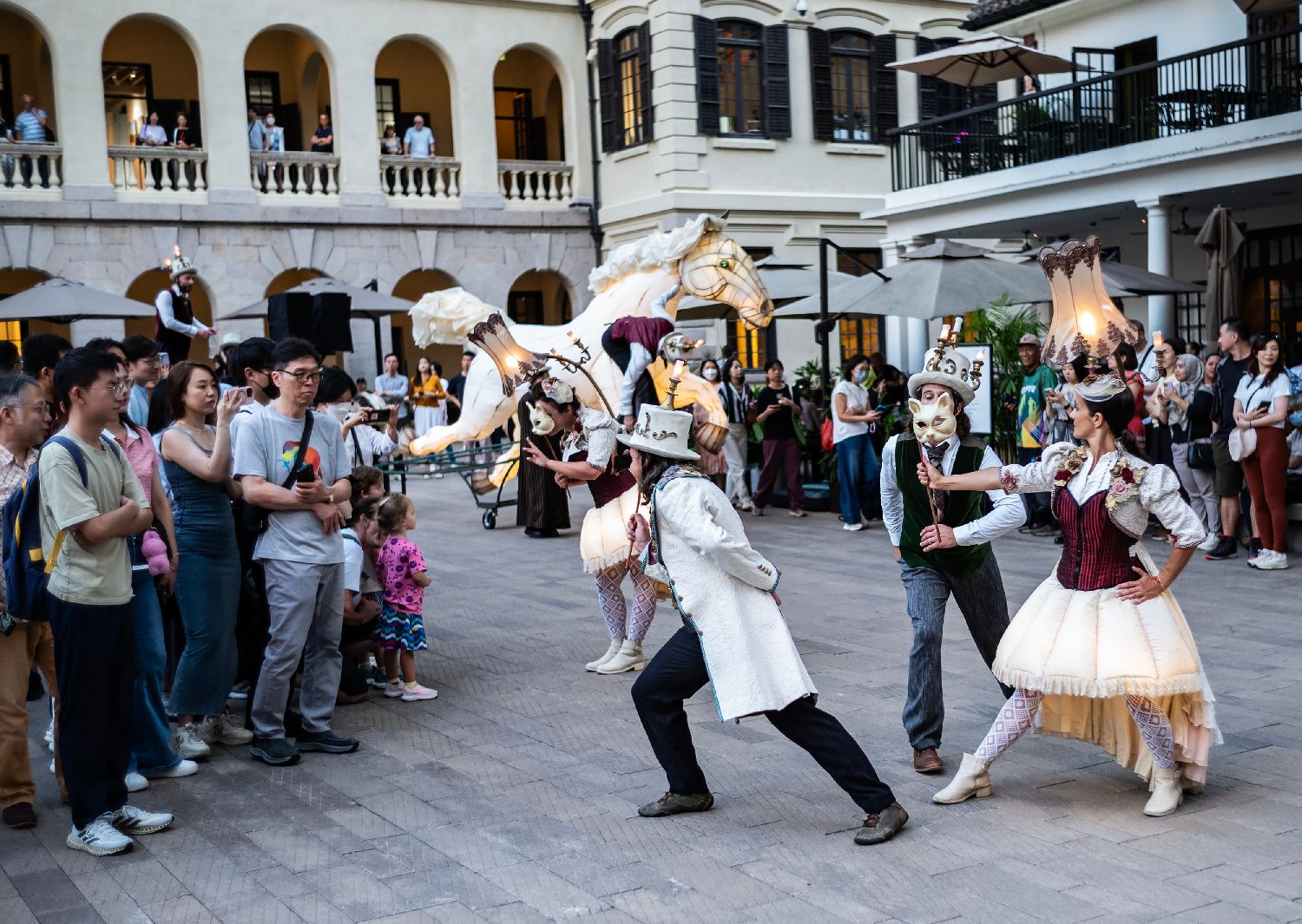 5月14日,“法国五月艺术节”内容之一的《幻夜舞会》在香港大馆检阅广场上演。演出编导受法国已故印象派画家雷诺阿和德加的画作启发,将视觉艺术、杂技、木偶表演和舞蹈融为一体,舞者们脚踩高跷、头顶仿制电灯和蜡烛装饰,随着法语乐曲翩翩起舞,带领观众重温19世纪末法国街头表演的魅力。图为舞者们为观众奉献精彩的演出。中新社