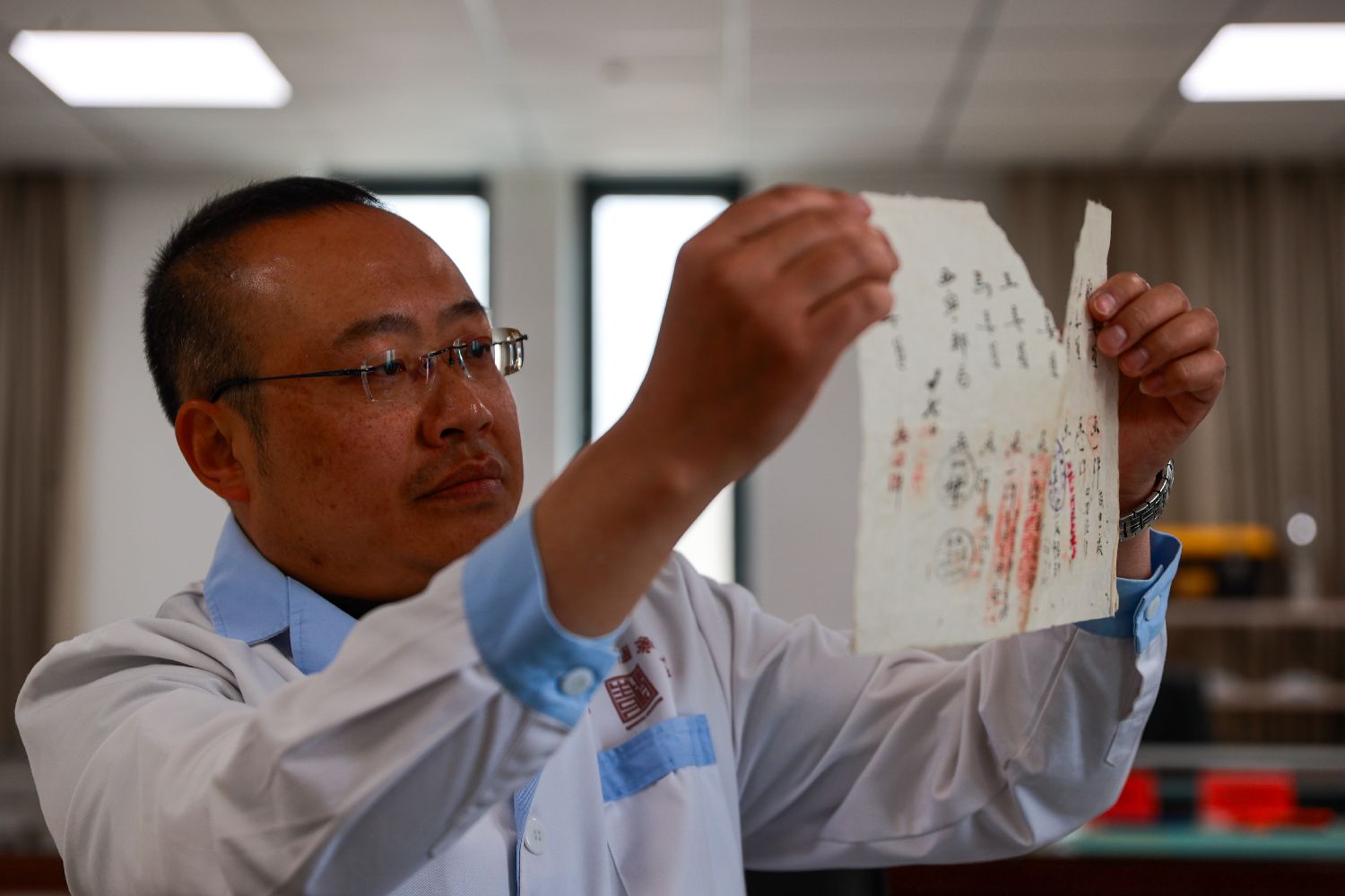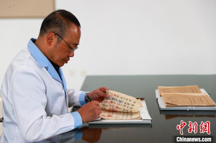 5月14日,档案修复师于伟检查修复完成的破损档案。中新网