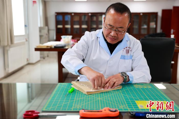 5月14日,档案修复师于伟装订修复好的档案。中新网