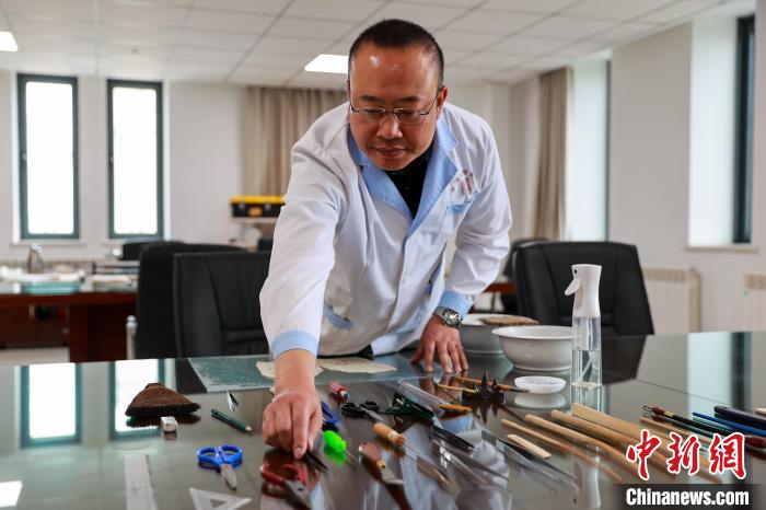 5月14日,档案修复师于伟选择修复破损档案所用工具。中新网