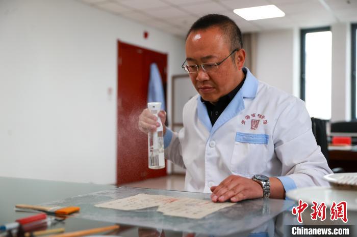 5月14日,档案修复师于伟给需要修复的档案喷水展平。中新网