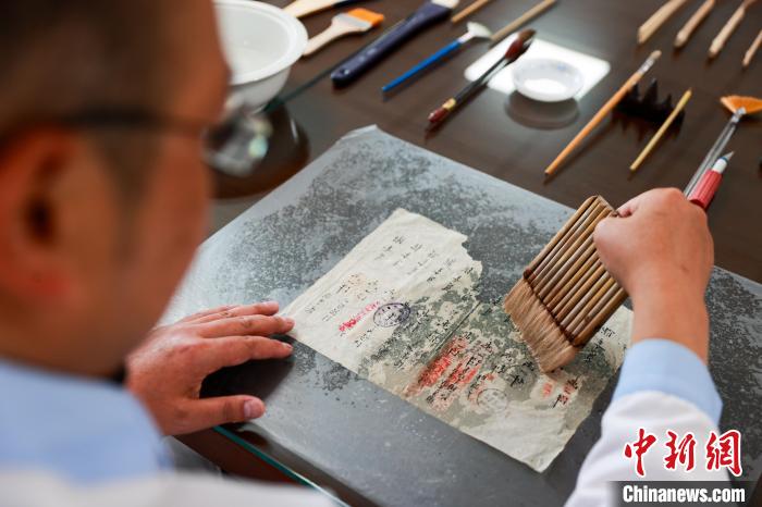 5月14日,档案修复师于伟给破损档案刷粘合剂。中新网
