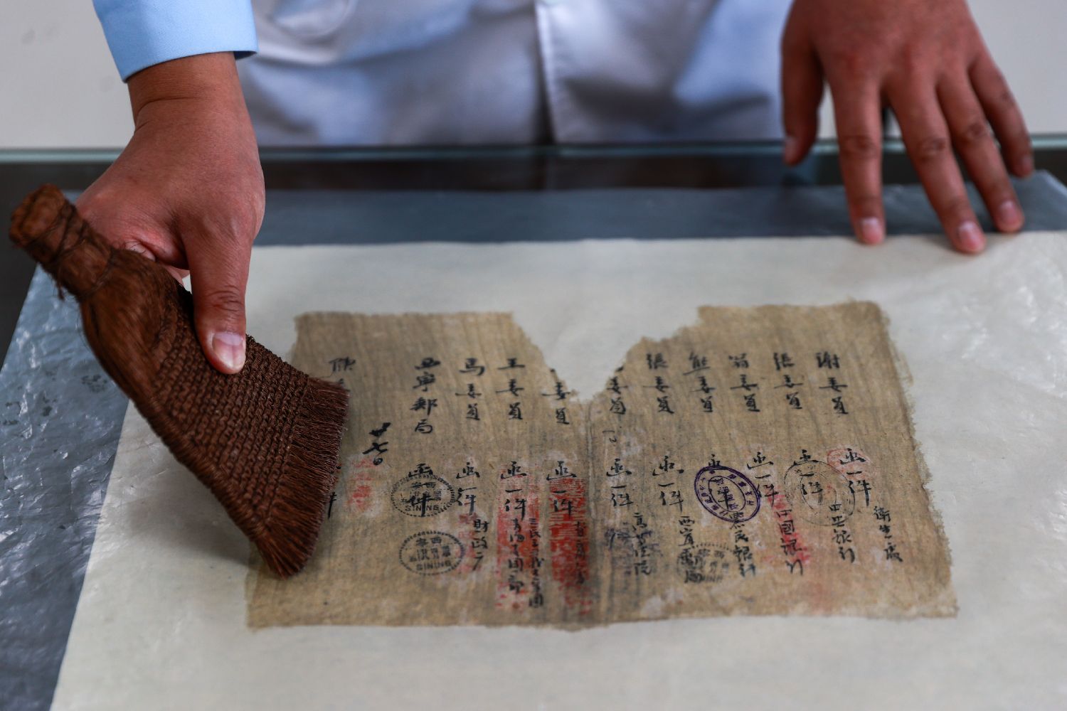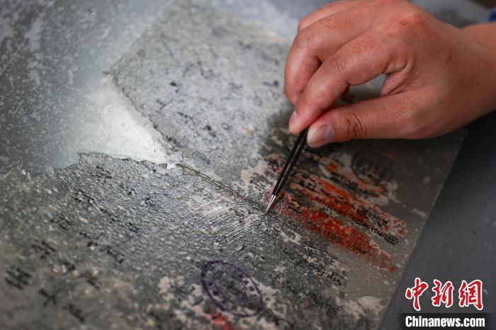 5月14日,档案修复师于伟用竹启子将修复好的档案下墙。中新网