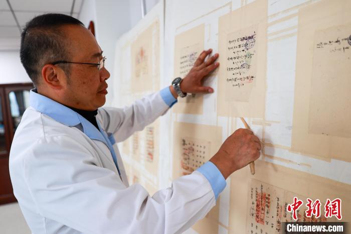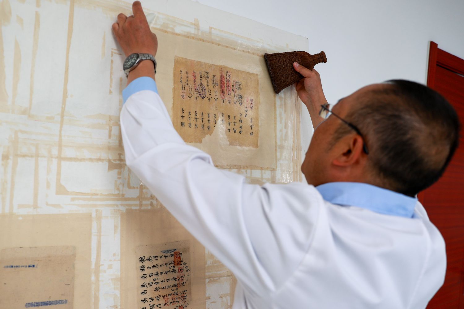 5月14日,档案修复师于伟将修复好的档案上墙固定。中新社
