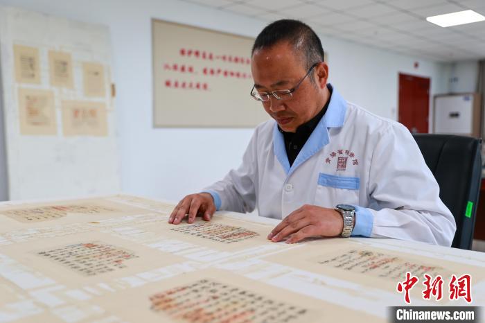 在青海西宁市的青海省档案馆档案修裱中心,档案修复师通过粘贴、裁剪、补缀等技术,用最小微的干预手段和最科学的方法技巧,让许多因保存时间久远而出现破损老化和字迹脱落的历史资料重现生机,为历史文化研究提供有力支撑,也便于提供查阅利用以及数字化加工。图为5月14日,档案修复师于伟观察仔细需要修复的档案。中新社